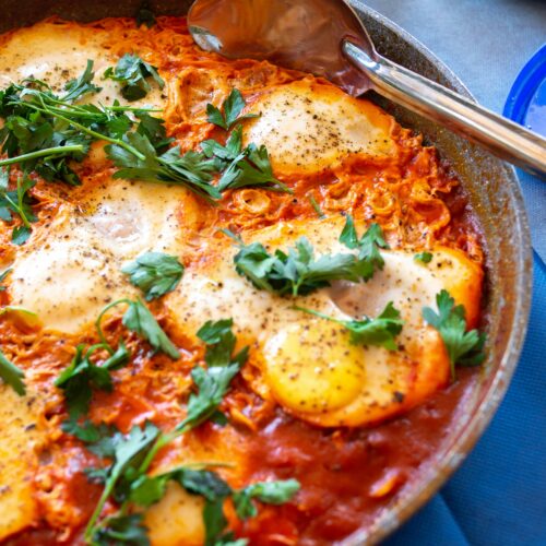 Shakshuka is een heerlijk en veelzijdig gerecht met gepocheerde eieren in een smaakvolle tomatensaus met paprika, uien, en specerijen.